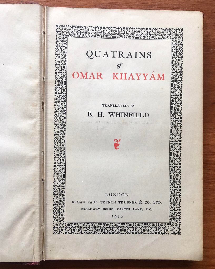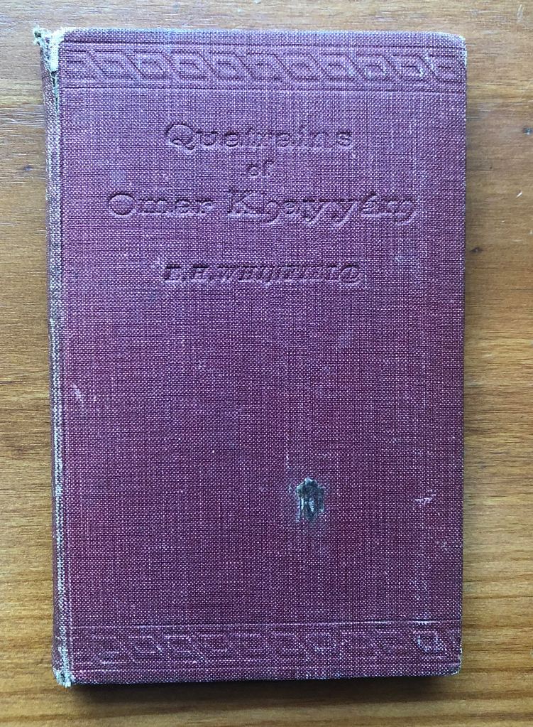 The book in question is, ‘Quatrains of Omar Khayyam’ translated by E.H. Whinefeld. It is quite a small, thin book and in fact measures 10 cm high, 15 cm wide and 8 mm thick.